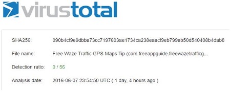 The app passed a malware scan by 56 scanners via VirusTotal.com.