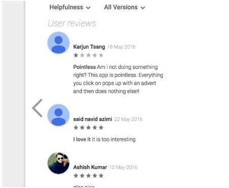 Another boost used by the fake app developer is to craft a barrage of fake reviews to bolster the popularity and entice consumers to install it. Other tricked users may also post a review to alert other potential users that the app isn’t what it claimed to be.